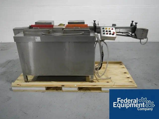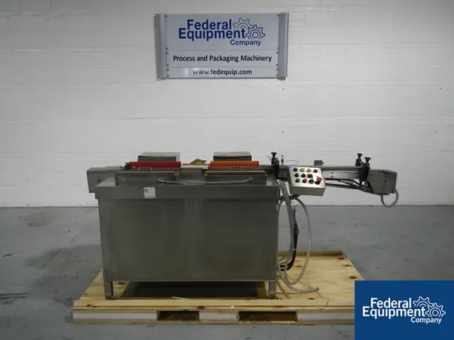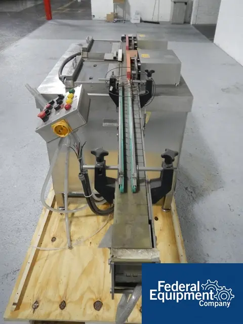 Kalish, automatic stainless steel water fall style cap elevator / feeder and sorter. Rated from 50 to 300 caps per minute – depending on materials and application. Capable of handling screw, snap or childproof caps (with proper change parts). a 10" wide x 75" long cleated cap conveyor belt with ...more
