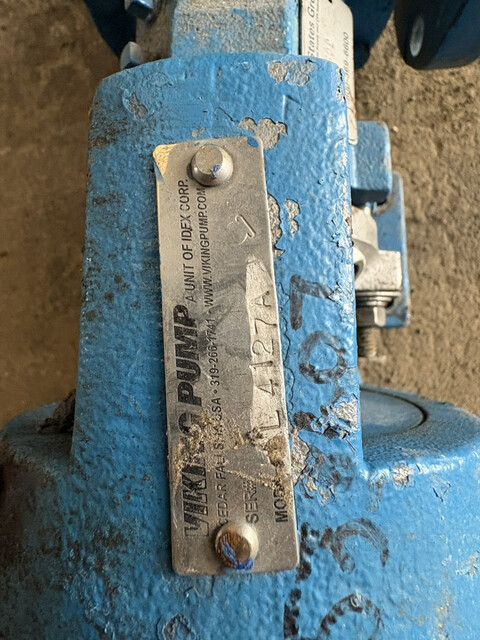 Brand/Model: Viking HL4195 : Used Viking HL4195 pump with Killark magnetic motor starter & Waukesha Thermostatic 165/180 temperature valve with the following s: • Serial 10596835 • Model: HL4195 • HP: 5 • Voltage: 230 / 460 • Dims (64" L x 54" W x 70"H) Applications: ...more