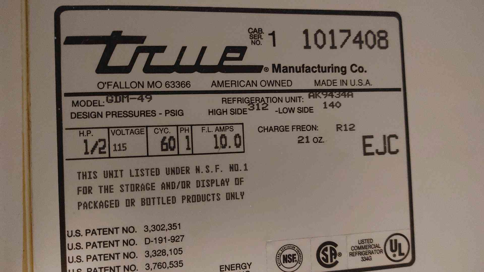 Model: GDM-49Horsepower (H.P.): 1\/2Voltage: 115Cycles (CYC.): 60Phase (PH): 1Full Load Amps (F.L. AMPS): 10.0Refrigeration Unit: AK9434ADesign Pressures - PSIG: High Side 312, Low Side 140Charge Freon: R12Charge Amount: 21 oz.Serial Number (CAB. SER. NO.): 1 1017408 30-Day Warranty & Functional Guarantee