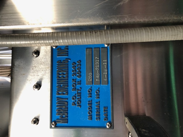 McBrady Model 200 Orbital Bottle Washer, ionized air rinsing, new in 2011, stainless steel construction, rated for up to 200 bottles per minute, Serial number A48-21317. Includes 72" diameter wheel. Includes infeed & outfeed conveyor frame and drive. With control box. Capacity: 200 Bottles/Minute.