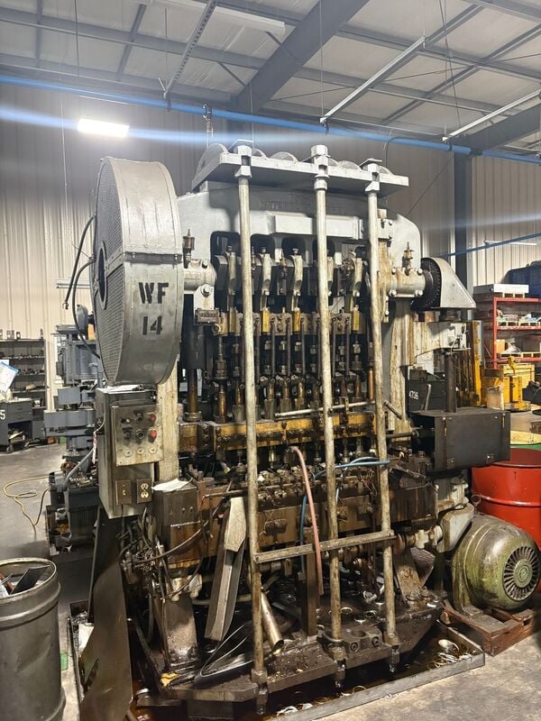 STATION. 11, TONS PER STATION. 5, CENTERS. 3-3/8", STROKE. 6", DRAW. 1-3/4", BLANK DIAMETER. 3-3/4", STROKES PER MINUTE. 50, BUMPER CAMS, FLYWHEEL, AIR CLUTCH AND BRAKE, TRABON MAXI-MONITOR UNIVERSAL CONTROLLER, MOTOR DRIVE: 60 HP, 500 V D.C., 1750/2100 RPM, WITH CONTROLS, OVERALL SIZE: 86" L x 69" W x 109" H ...more