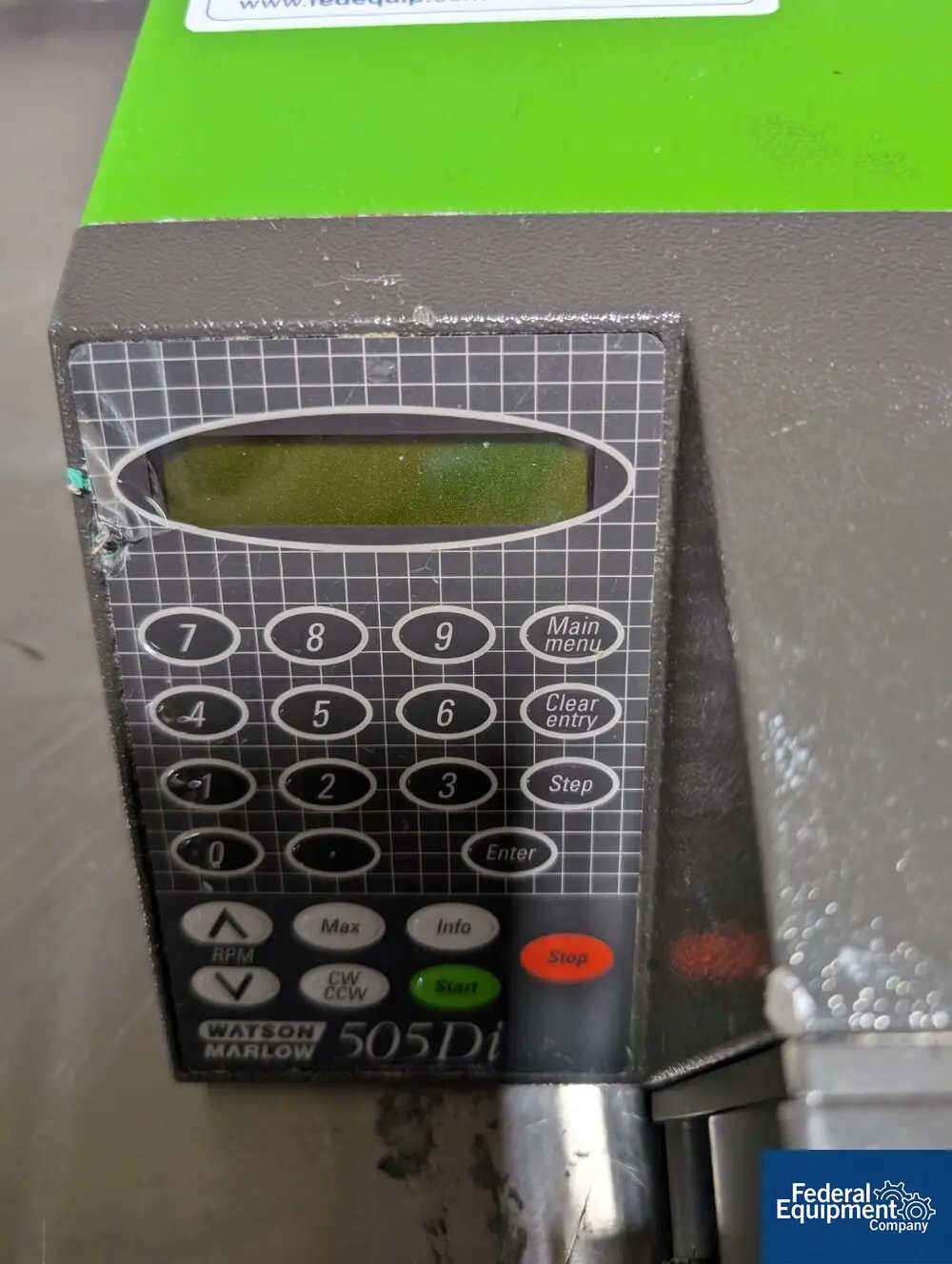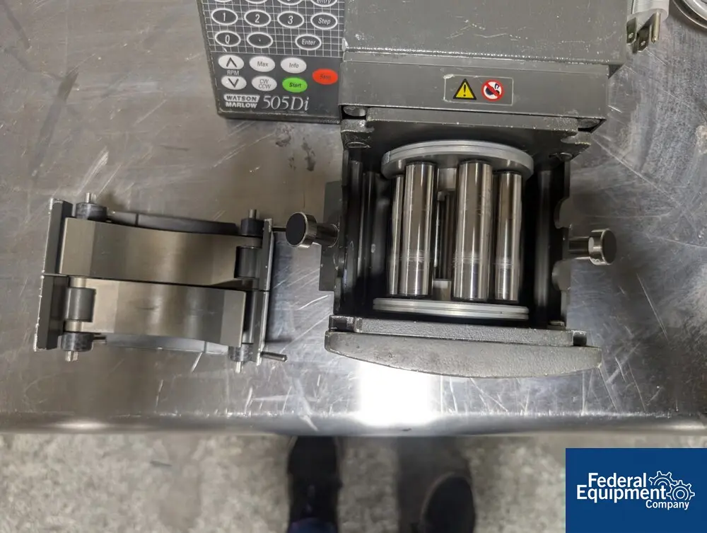 , used Watson Marlow Peristaltic Pump. 1/4 HP. Unit mounted on portable cart. 1/4 HP, 115/208-220 volt XP motor. Believed to be a model 505L. Pumphead has low inertia stainless steel rollers and twin offset tracks to provide smooth flows using double tube elements, or two individual tubes up to 9.6mm bore with 2.4mm ...more