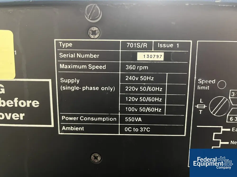 , used Watson Marlow Peristaltic Pump. 1/4 HP. Unit mounted on portable cart. 1/4 HP, 115/208-220 volt XP motor. Believed to be a model 505L. Pumphead has low inertia stainless steel rollers and twin offset tracks to provide smooth flows using double tube elements, or two individual tubes up to 9.6mm bore with 2.4mm ...more