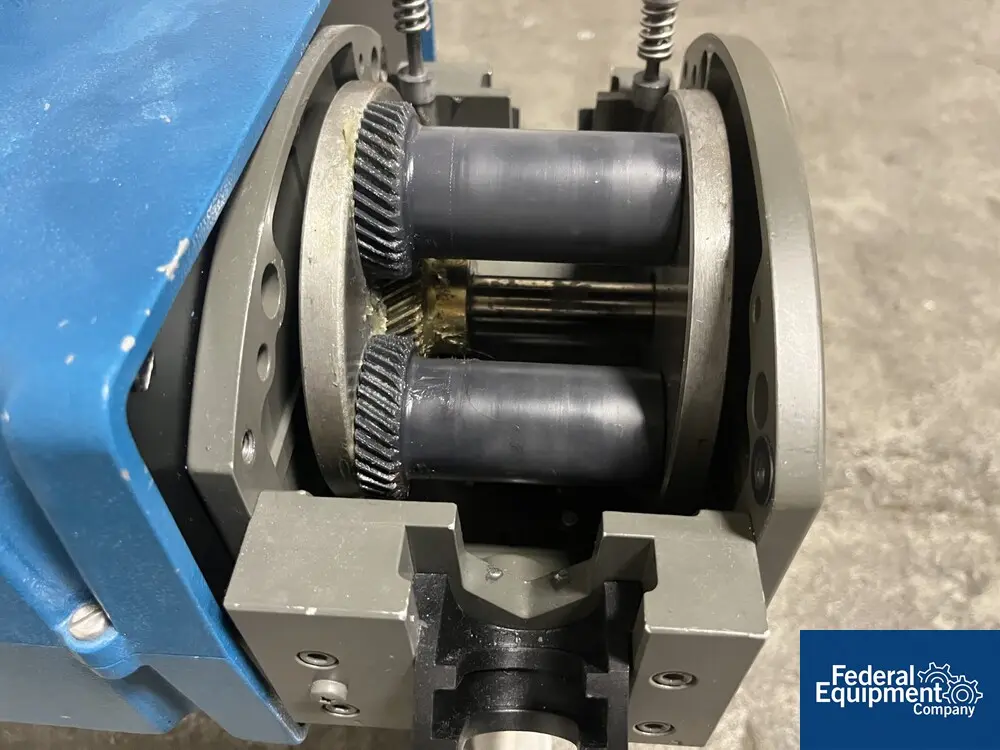 Pump, Peristaltic, 2 HP, stainless steel, Verdeflex, Mdl VF 25. Verdeflex Model VF 25 peristaltic pump, driven by 2 HP, 1740 RPM, 230/460 volt, 3/60 Hz thru gear reducer connected to rotor shaft. Model number VF 25 FCE 3MR/S, serial number 071448A2. Includes 1-1/4" diameter stainless steel threaded connections. ...more