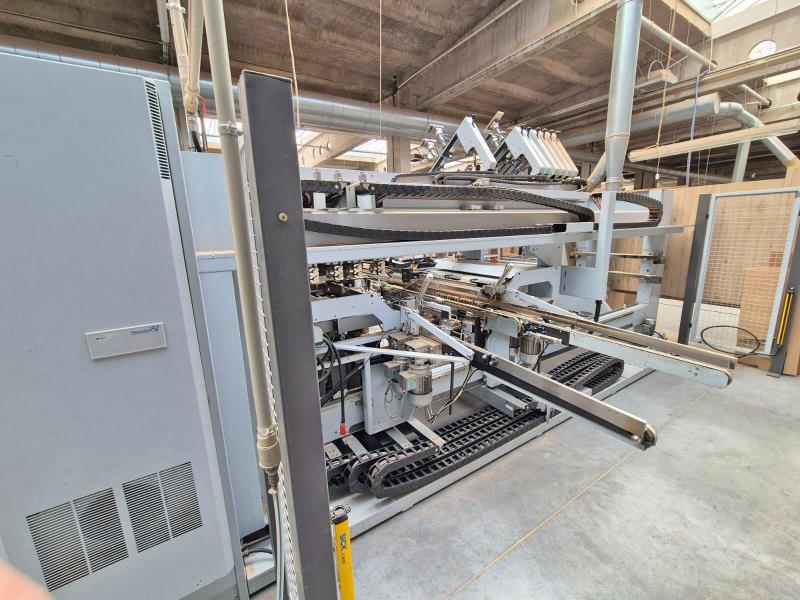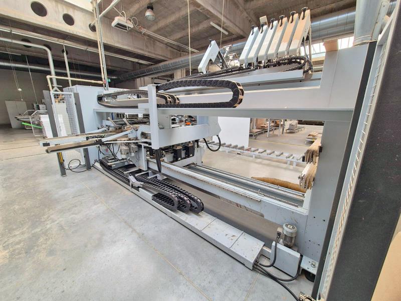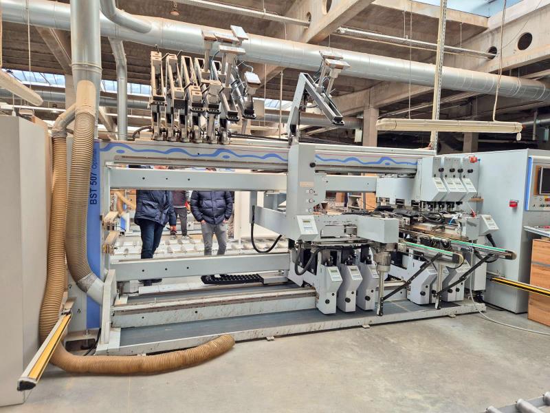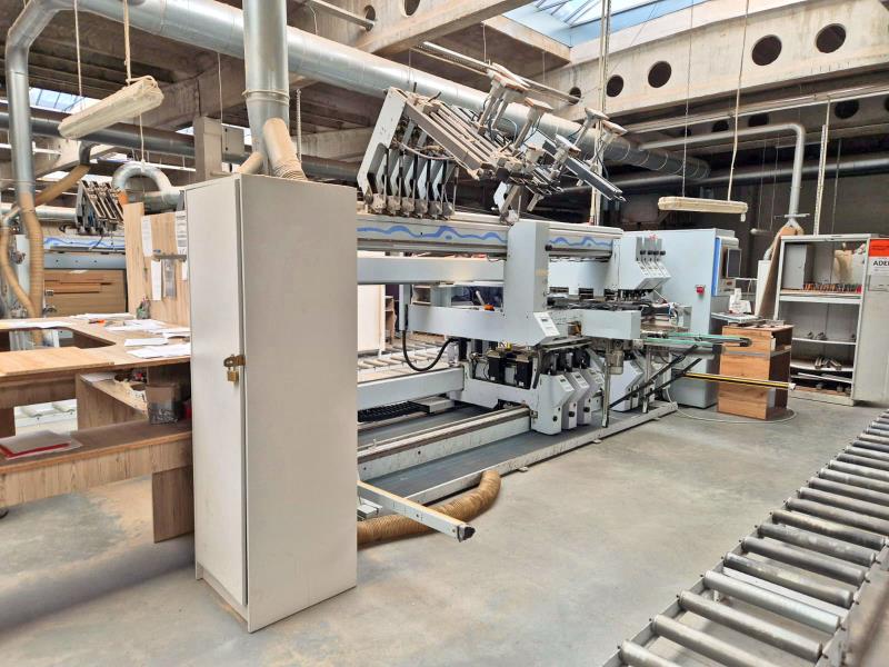 WEEKE - BST 507: Boring Machine (Feed Through CNC) -- SpecificationsWEEKE - BST 507 CNC Feed Through Boring machine with: 2,500 mm (98.4") Max. opening cap. in "X" axis left-right, 250 mm (9.8") min opening cap.; 1,000 mm (39.4") max. "Y" axis front-back cap., 100 mm (3.9") min front-back capacity. -- Horizontal UnitsRH & LH Horizontal boring with: (4) Units total; each unit is powered by a 2 HP (1.5 kW) motor; (1) 11-spindle chuck with vernier-scale for "Y" axis adjustment on each side of the machine + (1) additional 11-spindle chuck with LED display for "Y" axis adjustment on each side of the machine.RH Horizontal units are motorized for opening/closing adjustment in the "X" axis; the LH horizontal units are fixed in the "X" axis. -- Vertical Units(7) Bottom & (4) Top vertical units; 128 mm wide with: LED Display & motorized adjustment in the "X" axis; each vertical unit equipped with: (2) Boring blocks (swivel 0 - 90); each boring block driven by 2 HP (1.5 kW) motor.All vertical supports equipped with; "QUICK CHANGE CHUCK DEVICE"; pneumatic locking; LED readouts on all heads for finite adjustments. -- Transfer SystemVariable transfer belt speed control from: 35 - 75 MPM (114 - 246 FPM).1,050 mm (41") Long infeed & 1,020 mm (40") outfeed double belt transfers with: Manual up/down flip movement for ease of machine entry & adjustments; removable panel support rails. -- Operator & Machine ControlPC Front end with: HOMAG "Power Control "PC 85T" + WoodWOP for BST Operating System.The NC allows for the storage of the data within the panel program & the serial transmission of data transferred to the LED display units on the machine heads for positioning visualization of the: "X", "Y1" & "Y2" Axes for the vertical & horizontal units; the transport belt speeds & automatic working cycles.The machine opening & closing in "X" axis; the double top clamps movement in "X" axis is by means of Servomotors. -- BST 507 Complete with: (7) Over-turning double top-clamp holddown cylinders with motorized adjustment in the "X" axis; (1) chip transport belt removal system with: (2) 160 mm dia. Dust ports; safety light curtains.