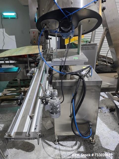 TotalPack DS-200A Spindle Inline Capper, operates at up to 150 bottles per minute, handling cap diameters from 25mm to 120mm (1" to 4.72"), bottle diameters from 30mm to 200mm (1.18" to 7.87"), and bottle heights between 50mm and 280mm (1.97" to 11.02"). The overall dimensions are 48"x40"x72" with a weight of 750 lbs. ...more
