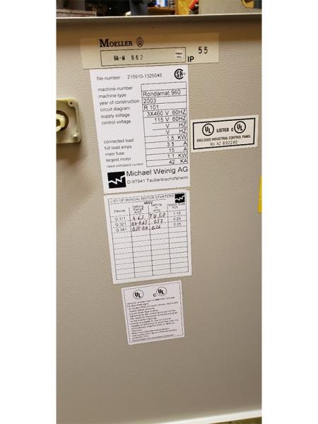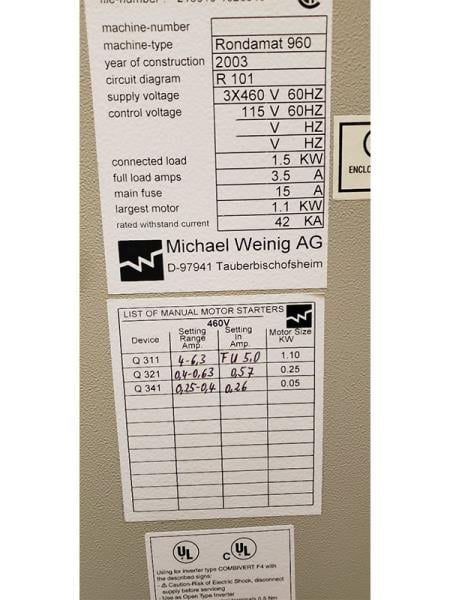 WEINIG RONDAMAT R960 Profile Grinder Working Dimensions: -- 9-29/64" maximum tool width; 3-15/16" Minimum to 11-13/16" Maximum cutting circle. -- Grinding Wheel: Diameter 5-29/32" min to 8-7/8" max. grinding wheel bore - 60 mm. Onboard diamond wheel dressing tool. -- Drive: Variable Frequency Controlled Drive giving a spindle speed - 1,500 to 3000 RPM; 1.5 HP Motor. -- Template carrier: Utilizes a template stylus-copy system, whereby the tool head table copying-grinding is effortless (precision linear floating table movement feels smooth as if there is zero gravity). Resistance template cross support with setting gauges for axial constant system; axial (side) clearance angle 0 - 20. Holder for fixed and revolving tracing pins; for easy follow of the template to grinding aggregate. -- Coolant: 13 Gallon coolant tank capacity with 1.2 HP coolant pump. -- Includes: Manuals and 1-13/16" arbor.
