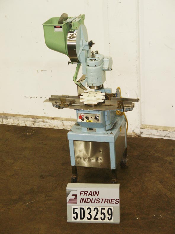Fully automatic aluminum capper capable of speeds from 50 to 120 bottles per minute – speeds depending on materials and application. Cap size range: 11mm to 38 mm and bottle size range: 13mm to 203mm (with proper change parts). features an 8 pocket star wheel. Additional size change parts available at additional cost. Equipped with mechanical hopper, cap chute, star wheel container handling and stainless steel infeed/discharge conveyor. Unit mounted on casters for ease of mobility.
