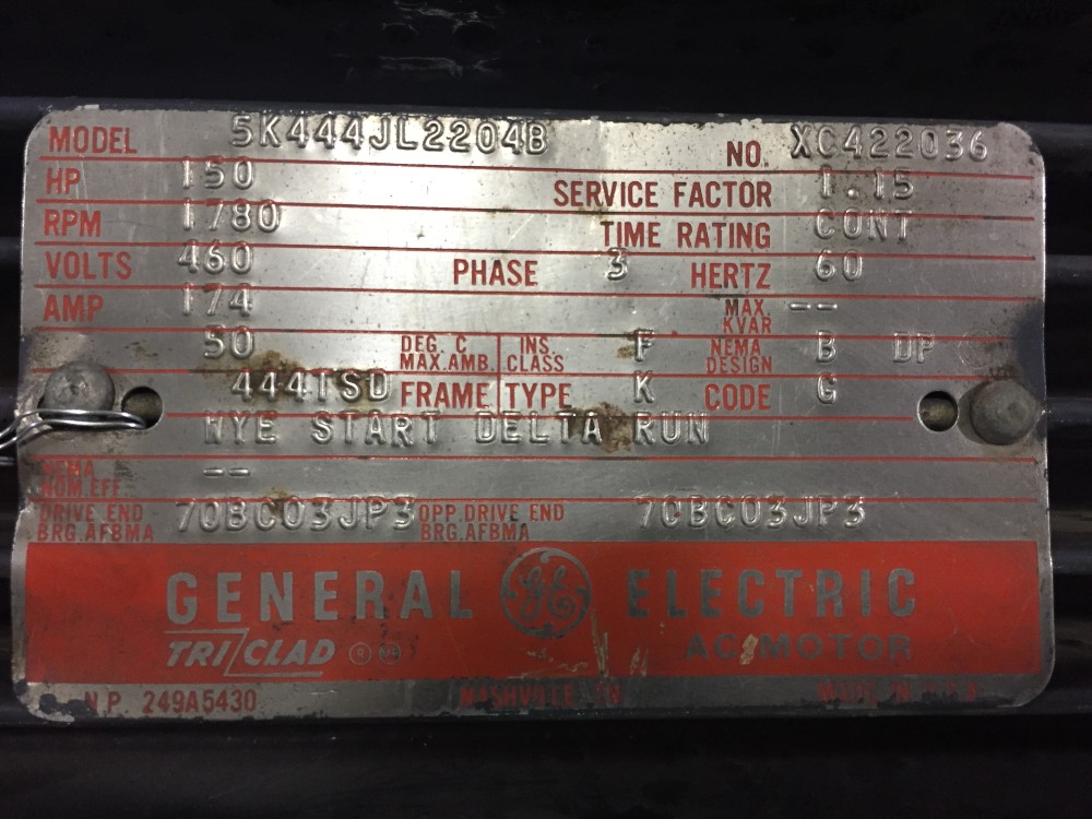 150 HP 1780 RPM General Electric, Frame 444TSD, 1.15 service factor, cont., 460 Volts