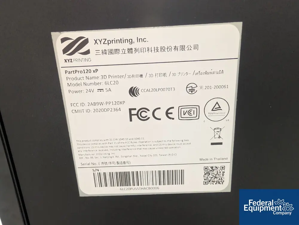 Used XYZprinting partpro120 xP 3D printer, model 6LC20, serial# 6LC20PUS5THACB0006.