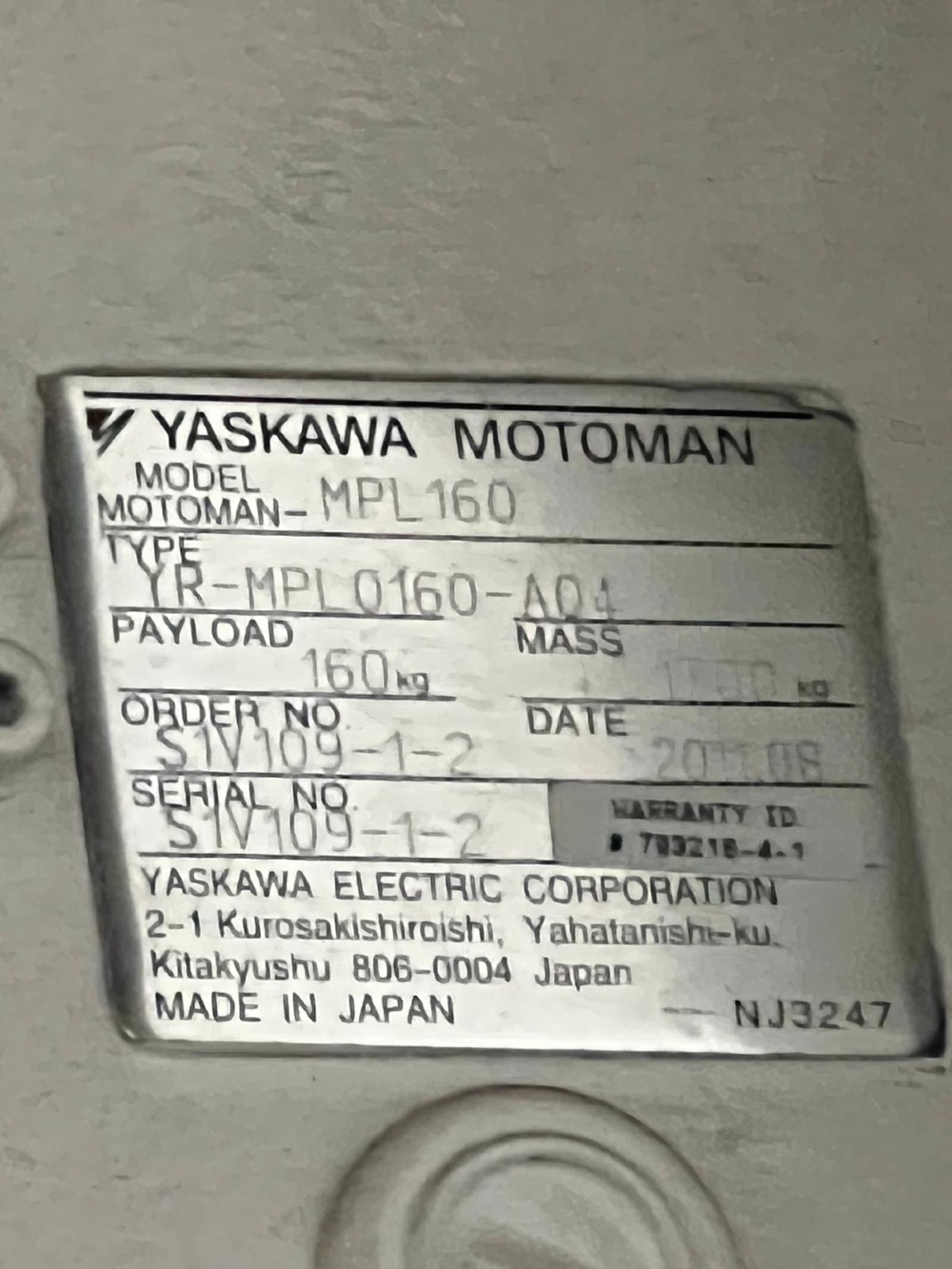 Inventory No. 0126-125-0001 Manufacturer Yaskawa Electric Corporation Model No. MOTOMAN-MPL 160 Name Robot Arrival Date 02-19-2026 Dimensions L x W x H (inches) 133 x 56 x 107 Weight (lb.) 4325 Category Robots Condition Used Available Quantity 1 Serial No. S30N39-1-1 Make Year 2014 Item Made In Japan.