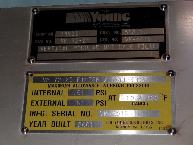 , Used Young Pulse jet. Unit is vertical mount. Bags are horizontal. Pulse jet type., 1969 YOUNG H42-18, FT2. 82 ft, Type. PULSE JET, Material. 304 SS, ACFM. 261, FT2. 82.