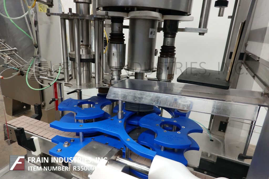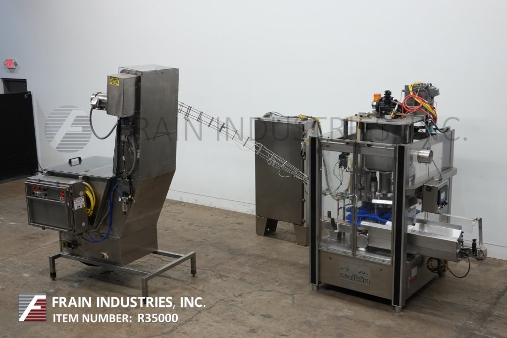 Zalkin, Stainless steel, 3 head rotary chuck capper and feeder. with number of containers per minute and hour – depending on materials, application and machine configuration. Equipped with waterall style cap sorter and feeder with 36" long x 42" wide x 36" deep cap hopper, 22" wide belt conveyor with cleats set on 5¾" centers and has 85" discharge height. Capper equipped with 4½" wide plastic delrin belt conveyor, worm screw to star wheel in feed, (3) head chucks set on 6" centers and star wheel discharge. Control panel has A/B controller and A/B touch screen HMI and start, stop, e-stop push buttons. Mounted on heavy duty frames. Designed to apply aluminium roll-on caps to carbonated or non-carbonated beverages of plastic or metal pre-threaded press-on or push-in caps, pourrers, stoppers, overcaps, stopper corks,rubber plugs and more..