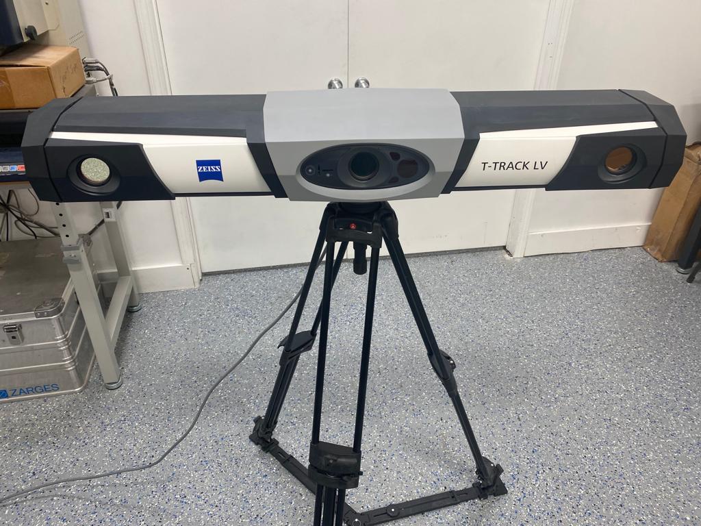 This is a 3D laser scanner, with a tracker, and a handheld probe that is tracked by the tracker. The tracker model is LV ( large Volume ) , it has a range volume of about 25-30 ft, in single setup