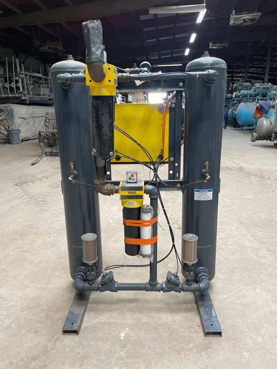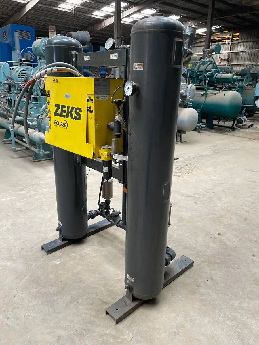 ZEKS Heatless Regeneration Eclipse Desiccant Air Dryer - Model: 160ZPA10M00A, Serial No: 527350. Desiccant: 96 LBS Per Tower. Max Inlet Air Pressure: 150 PSIG. Max Temp: 120 F. Power Requirements: 60 HZ, Volts: 115, PH: 1. Min Circuit AMP: 4. ZPA Models utilize a portion of the dried compressed air volume for regeneration of the desiccant media. ZPA dryers deliver -40 F pressure dew point. Total Dimensions 25L x 64W x 88H. Shipping Weight: 2200 LBS.
