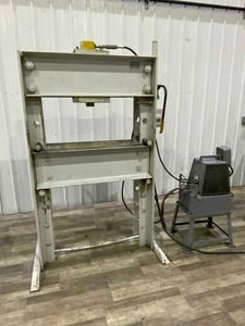 50 Ton, Enerpac #050, hydraulic H-frame press, 13" stroke, 42.5" x 17" bed area, hand crank for bed adjustment, 2 HP